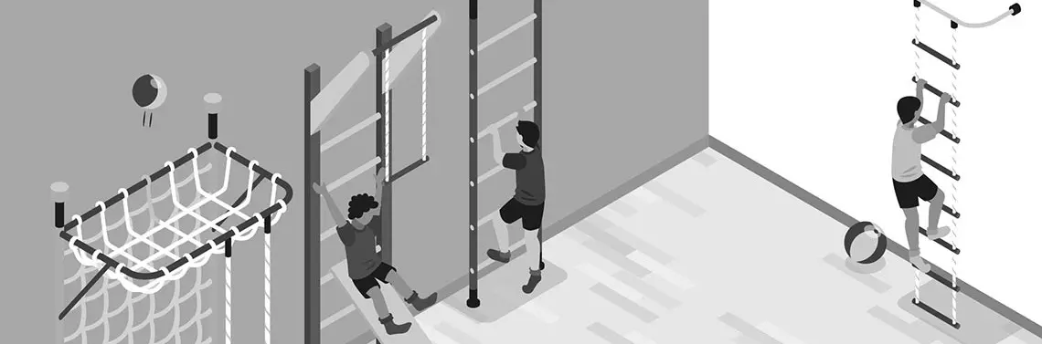 Opis ćwiczenia: Dziecko wspina się na samą górę i przy asekuracji terapeuty zaczyna wisieć na najwyżej umieszczonym drążku. Następnie prosimy, aby dziecko poruszało nogami w prawą, a następnie w lewą stronę, przypominając tym samym wahadełko.